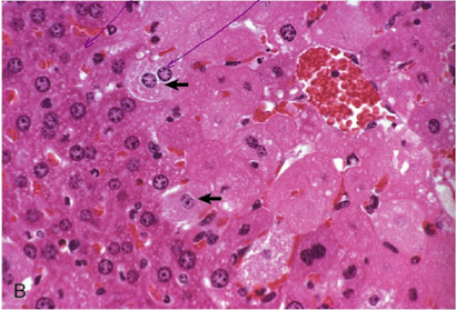 Arrows: nuclear pyknosis- irreversible condensation of the chromatin