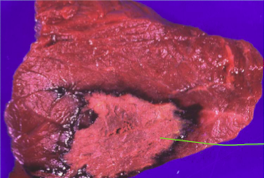 Name the following features in the diagram below, organ location and the type of necrosis: