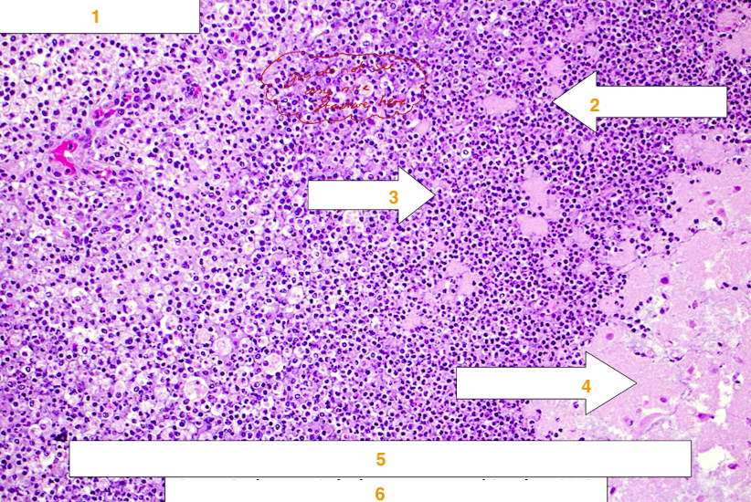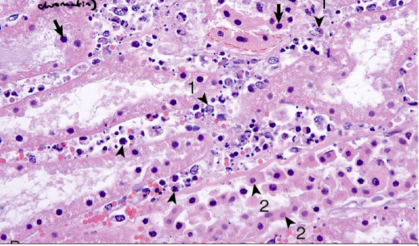 Arrowhead 1: karyolysis - dissolution of the cells nucleus