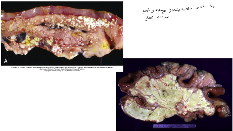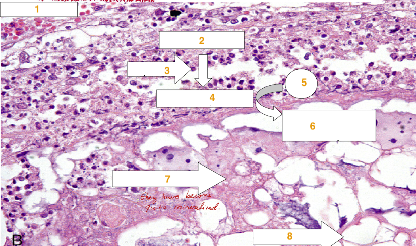 Name the following features on the slide of fat necrosis below: