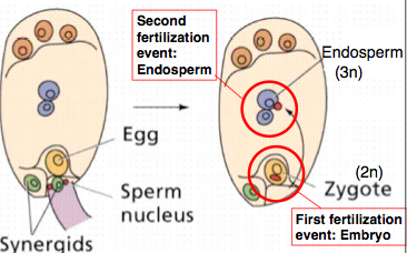 • Double fertilization: 1) one gives rise to the embryo, 2) other gives rise to the endosperm (food reserves, but only if fertilized!) • Pollination diverse mechanisms (e.g., wind, insects); many are specific.