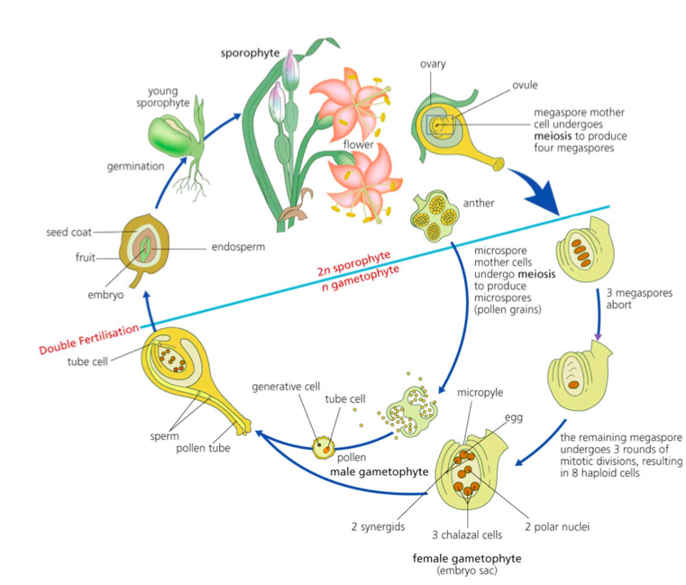 Describe the life cycle of an angiosperm: