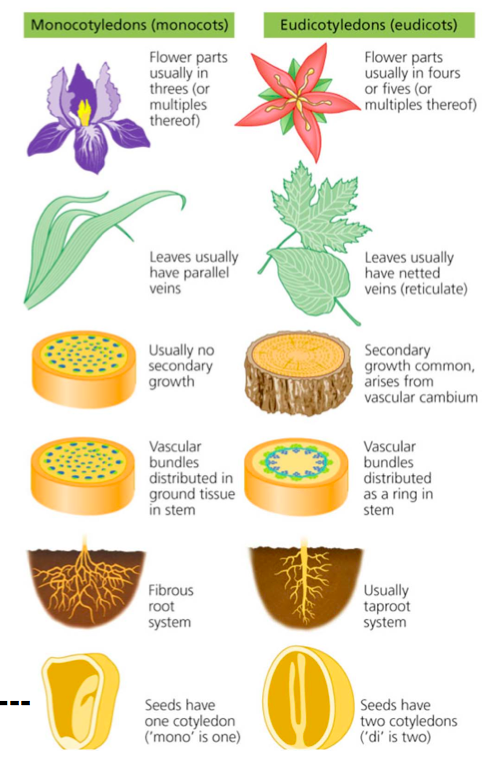 dicots= secondary growth in circles, monocotes= not as much, as vascular bundle is dispersed in the plant
