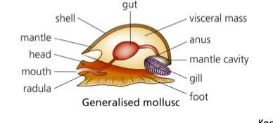 -variations on the same basics -mantle= dorsal body wall which often forms shell -mantle cavity= space between mantle and main body where gills or lungs are found -muscular foot= used for moving, feeding and manipulation -head with specialised mouthparts= radula -radula= almost like a tongue herbivore= like sand paper scrape the plant predator= tears the pray