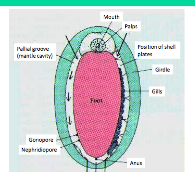 -chitons, (coat of mail shells) -exclusively marine -bilaterally symmetrical -shell consists of 8 large plates surrounded by a girdle of smaller spicules -mostly feed on algae or encrusting organisms bit some are predators -reproduce sexually, some brood their young in their mantle -overlapping shell plates predatory ones= they are sit and wait predator just slap and eat it -some protect the young in their mantle -gonopore= where eggs and sperm come through -nephridicopore= waste hole, in some also reporductive