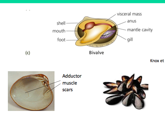 -clams, mussels. oysters -marine and freshwater -characterised bytwo shells; no distinct head -lost radula; filter feed (sometimes through foot) -often live buried in the sand -gills function for gas exchange and food collection -reproduction is usually sexual and external -trocophore larvae typical -releasing sperm and eggs out -free swimming larvae -can filter some viruses etc from water -abductor muscles= holed the shells closed