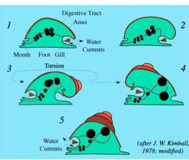 -as snails develop their body twists (torsion) -result= 180 degree turn in body inside shell -advantage= mantle cavity anterior (allows withdrawal into shell) -disadvantage -anus empties mouth