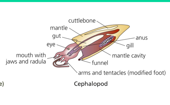 caphalopoda= head-foot -squid, octopus, cuttlefish, Nautilus -marine, free-swimming -shell reduced to internal support(except Nautilus) -mantle used for propulsion -foot converted into tentacles -cephalopods= one of the most intelligent among the invertebrates, use tools -excellent vision -pigment cells= chromatophores -visual signals= mate attraction, camouflage -similar eyes to vertebrates use visual signals in communication as well, male pretending to be female so it avoid fights and then tries to sneak in to sex can use coconut shell as protection= one of the first examples of non-vertebrate using “tools”