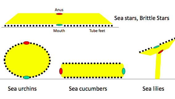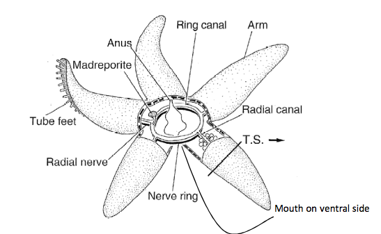 -entirely marine -5 main classes -sea stars (Asteroidea) -brittle stars (Ophiuridea) -sea urchins (Echinoidea) -sea lilies (crinoidea) -sea cucumbers (holothuroidea) -pentaradial symmetry as adults and bilateral symmeztry as larvae(indicate bilaterally symmetrical ancestry) -triplobastic -coelomate -DEUTEROSOME -no segmentation -spiny epidermis -have a water vascular system in the coelom (madreporite is teh opening of the water vascular system) -water system= different to nervous system moves in at the top and comes out in the feet tube feet connected to water vasular system can move independently aid in movement, just water pulling through= movement
