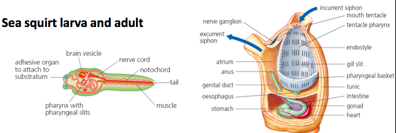 -defining feature of the chordates -stiff rod of mesoderm found next to the nerve chord in all chordate embryos (and some adults) -functions as an endoskeleton (like a backbone) -nerve chord- located dorsally -notochord that’s why they’re close to us genetically eat their brain as adults and lose notochord as well even humans= partly segmented