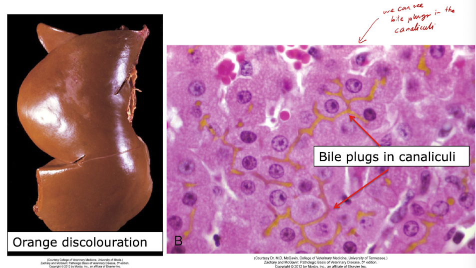 histopathology: cholangitis + necrosis of biliary epithelium w/cholestasis + dilated bile ducts