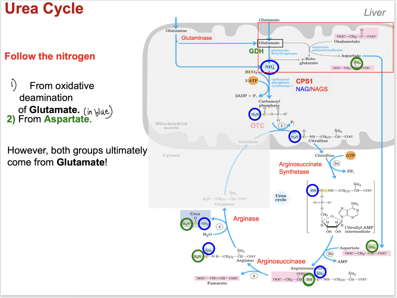 comes from glutamine (glutaminase) and glutamate (glutamate dehydrogenase)