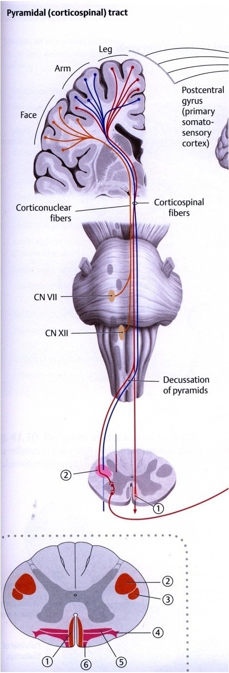 Eg: ventral corticospinal tract, descending, from motorcortex to spinal chord motorneurons, to muscles