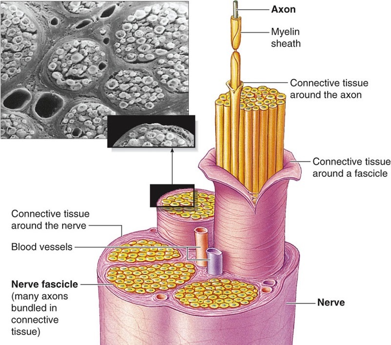 Nerve: bundle of peripheral neuronal axons (no neurons)