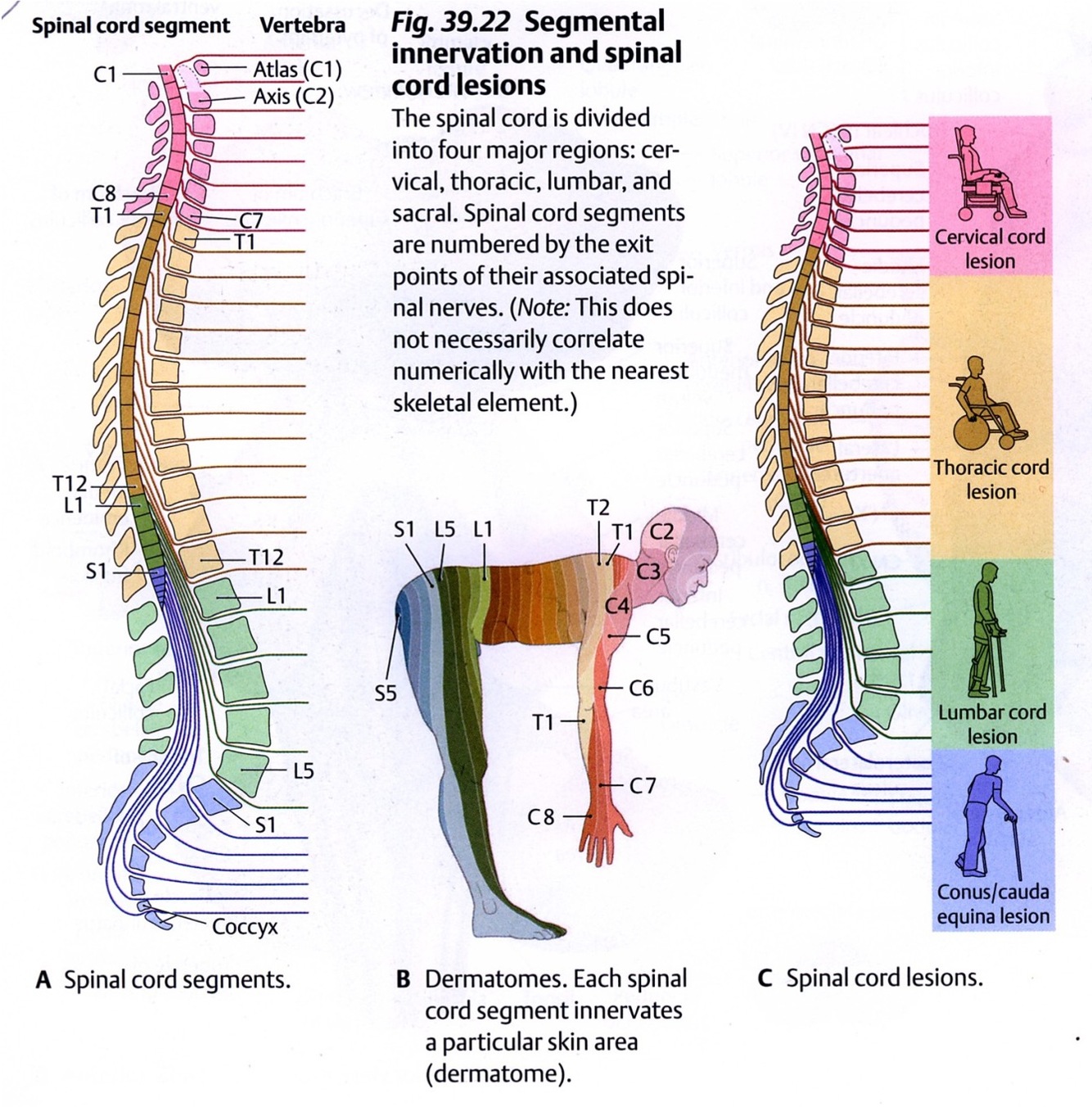Each segment of the spinal cord supplies a defined region afferent and efferent –> sensory and motor deficits can be asessed