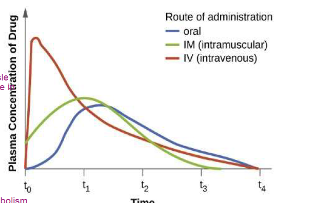 oral: one of the slowest ways; first pass metabolism (broken down in saliva, down to GI tract, etc); most common way for psychotherapeutic drugs