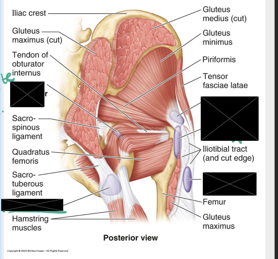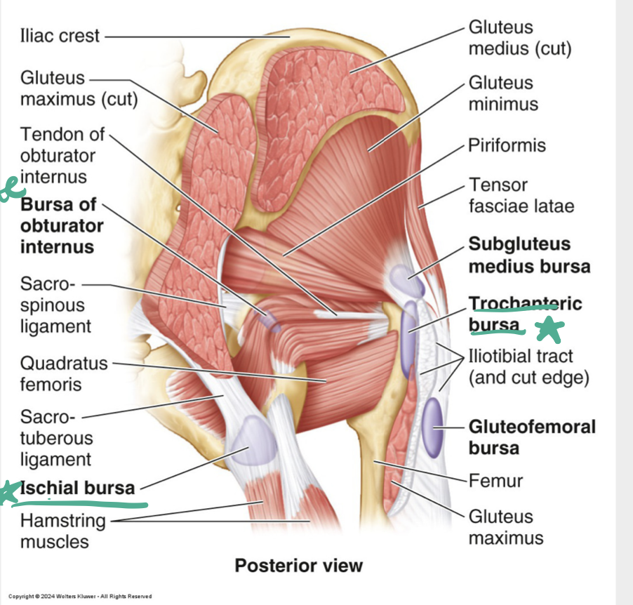 bursae and the ischial tuberosities (e.g., as from cycling).