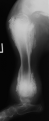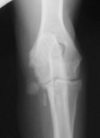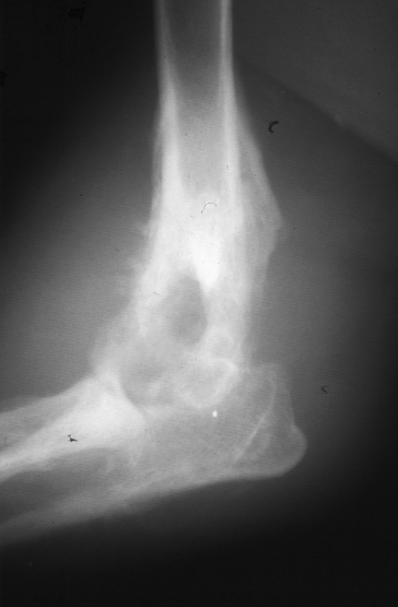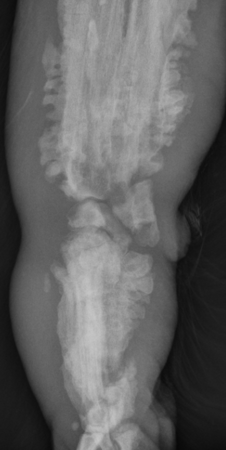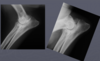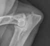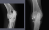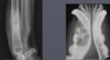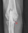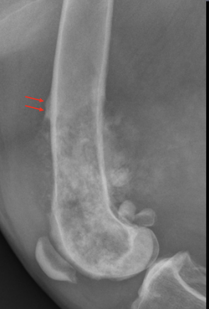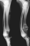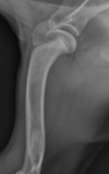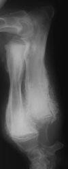 active periosteal reaction on the cranial aspect of elbow; inactive periosteal reaction on caudal aspect of humerus