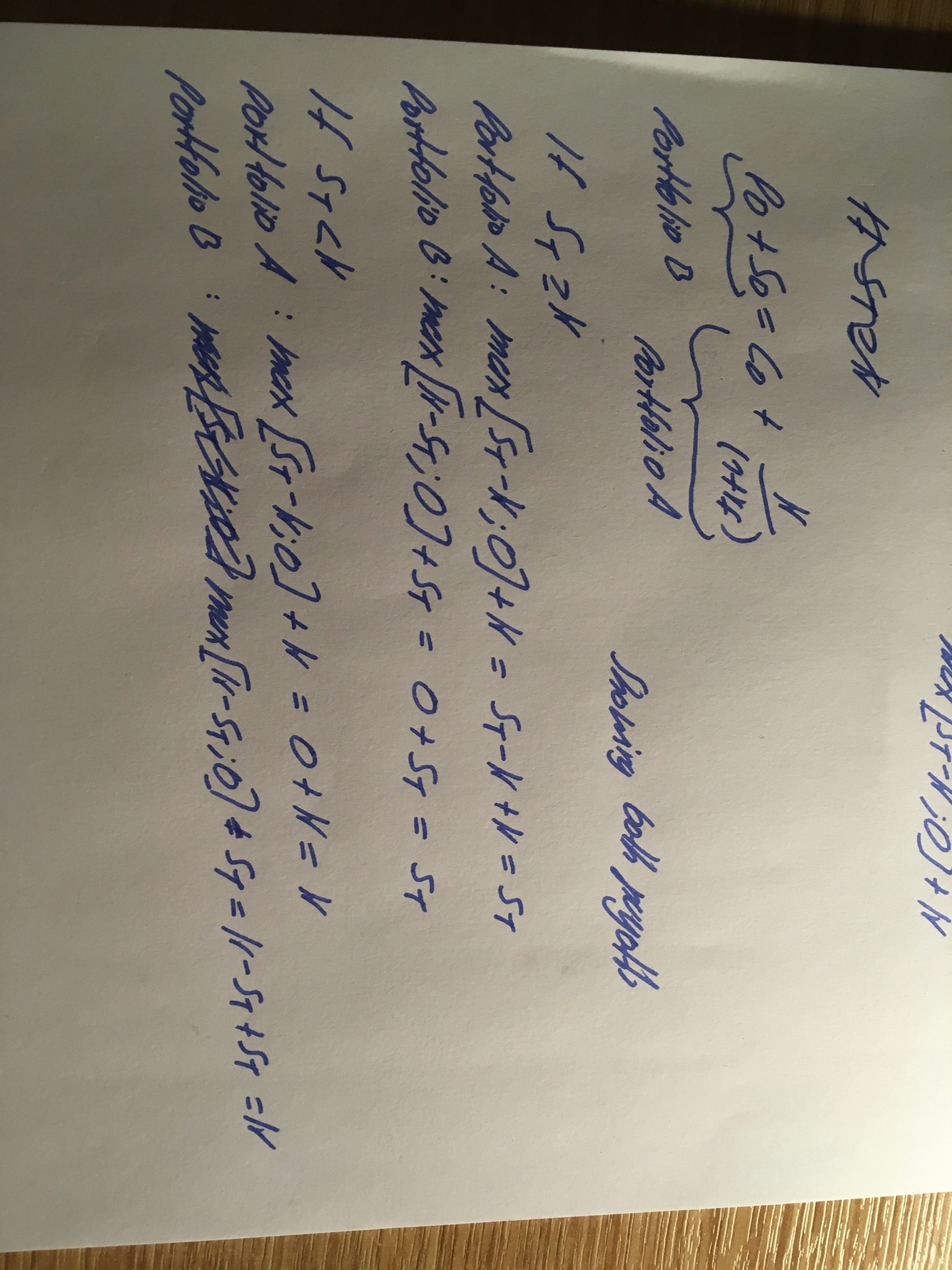 Proof that the value of a call (c) is at least as high as the share price today (S_0) minus the discounted strike price K/(1+r_f)