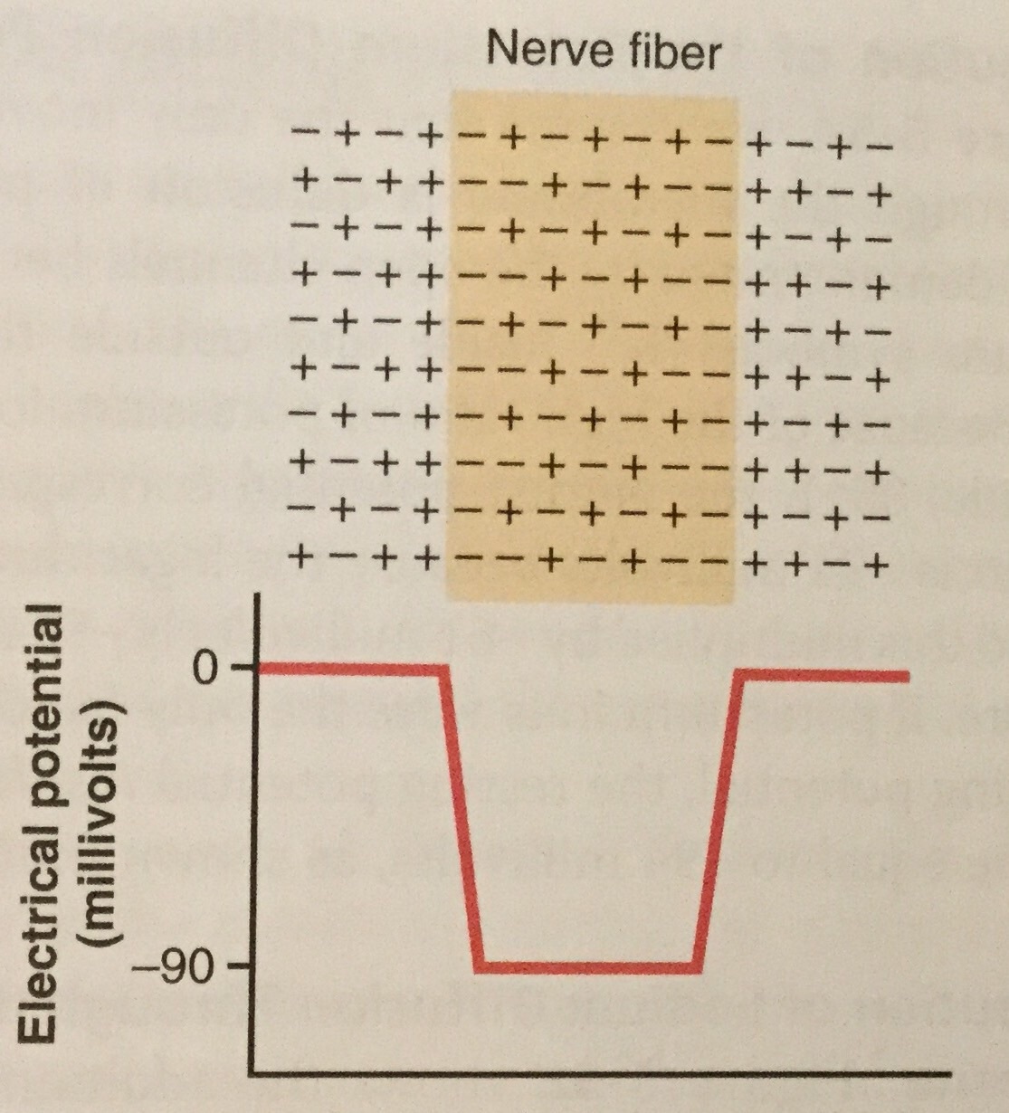 While in the same medium on the left, voltage is ‘0 mV.’ As the electrode pierces the cell, it reads the -mV produced by the (-) charges on the cell interior. It remains level throughout the cell as there is an even distribution of charges. As it passes through the other side of the cell, it returns to ‘0 mV.’
