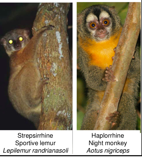 How are the eyes different in Strepsirrhines and Haplorrhines?