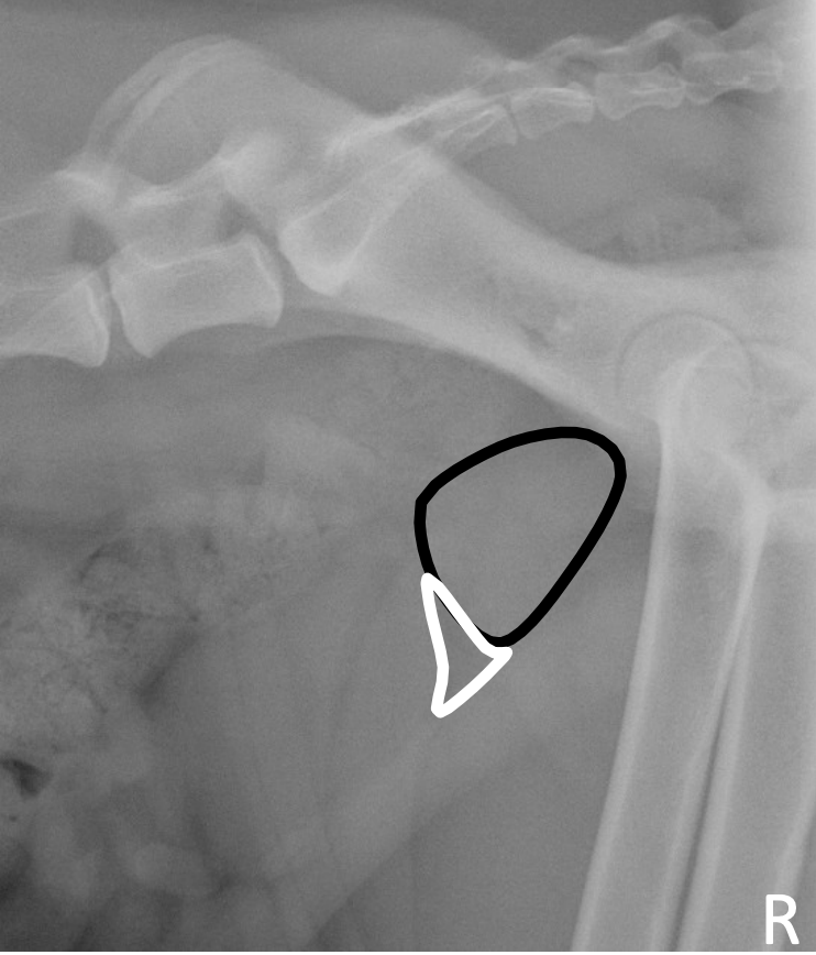 -should not occupy greater than 70% of the distance between sacral promontory and pubis on lateral view