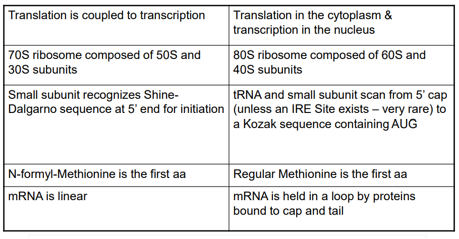 prokaryotic vs eukaryotic translation (location, subunits, how does it initiate, first aa, shape)