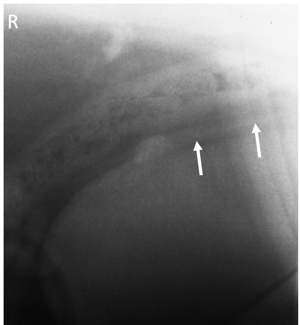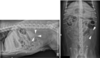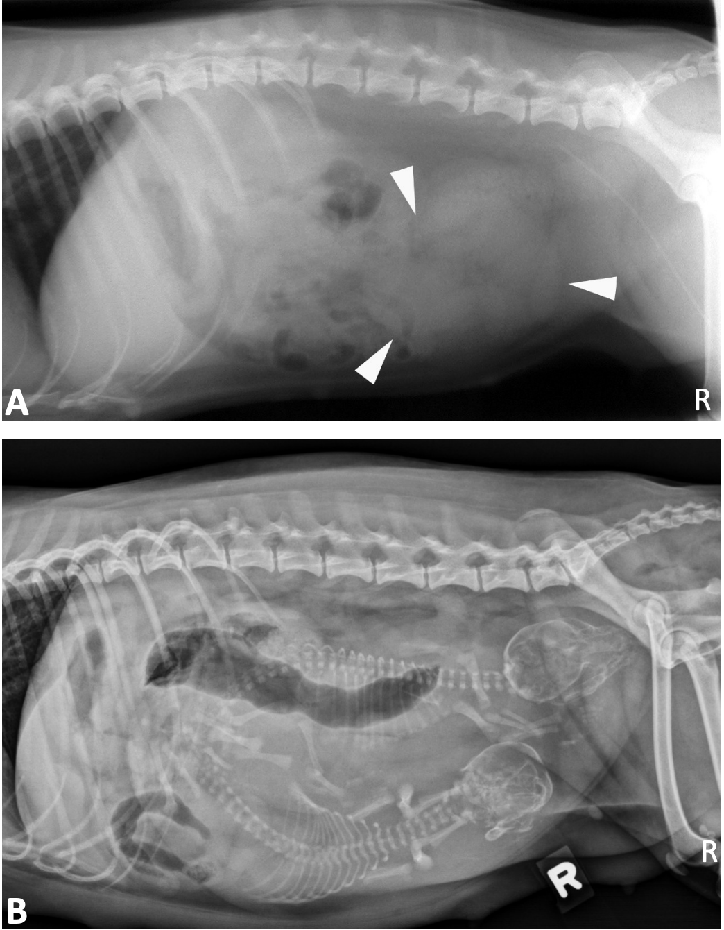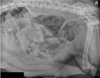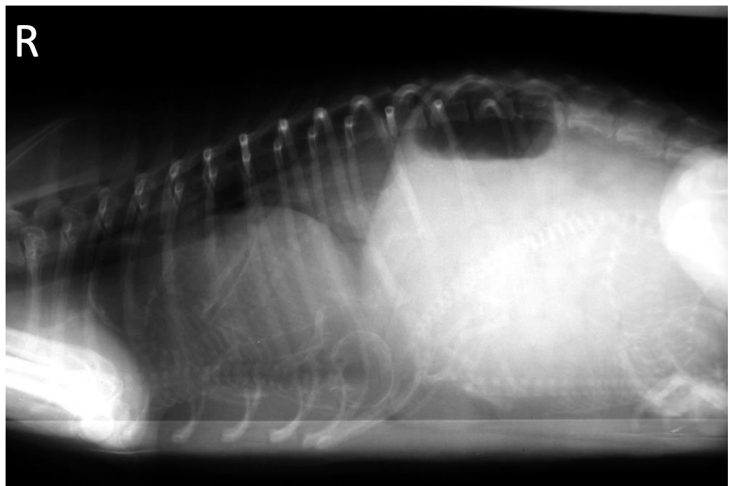 -mineralization of fetal bones around 45 days gestation in dogs; between 36 to 45 days gestation in cats