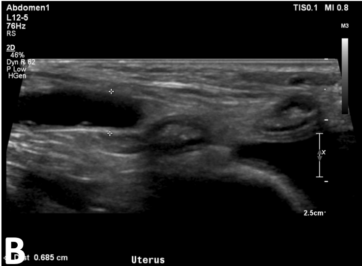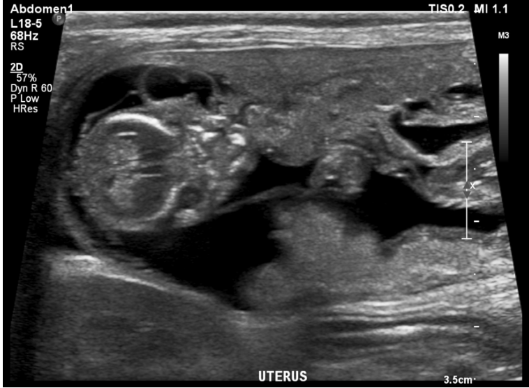 -two uterine horns observable around 30 days gestation in canine; 25-35 days gestation in feline
