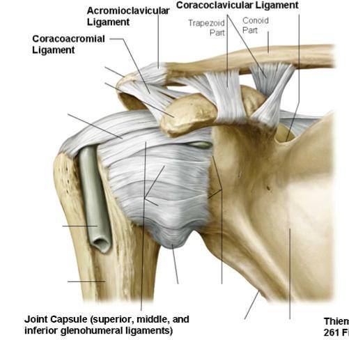 The trapezoid ligament stops rotation, protraction and retraction of the clavicle