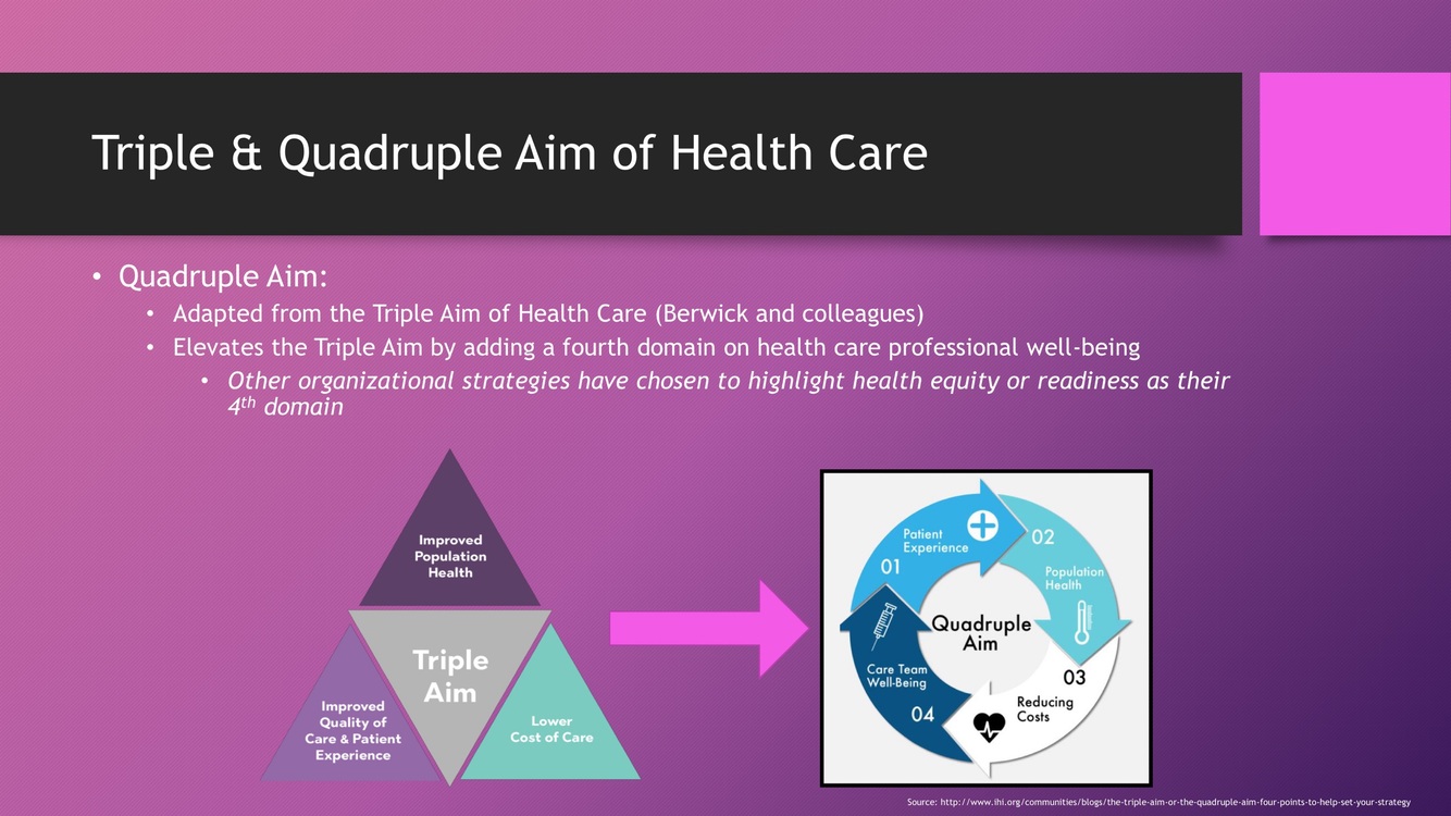 What are the triple and quadruple aim of healthcare?