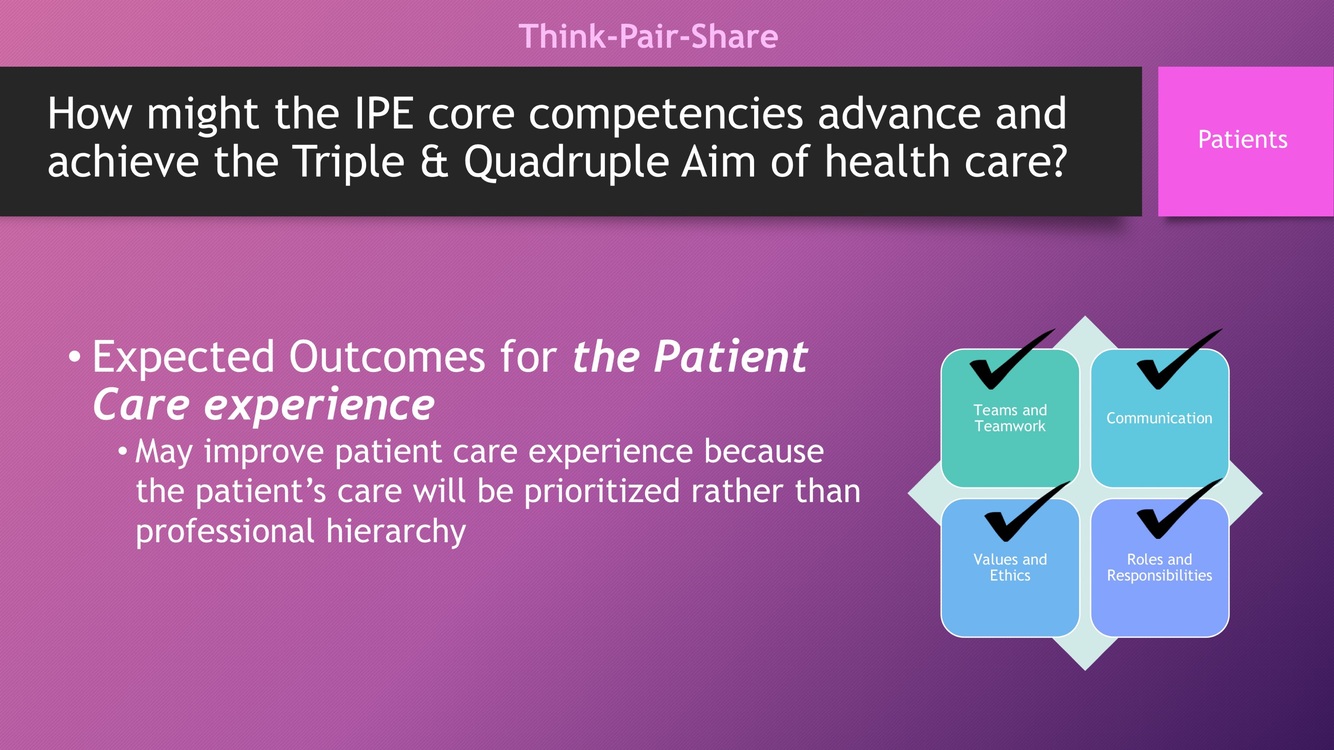 How might the IPE core competencies advance and achieve the Triple & Quadruple Aim of health care for patient care experience?