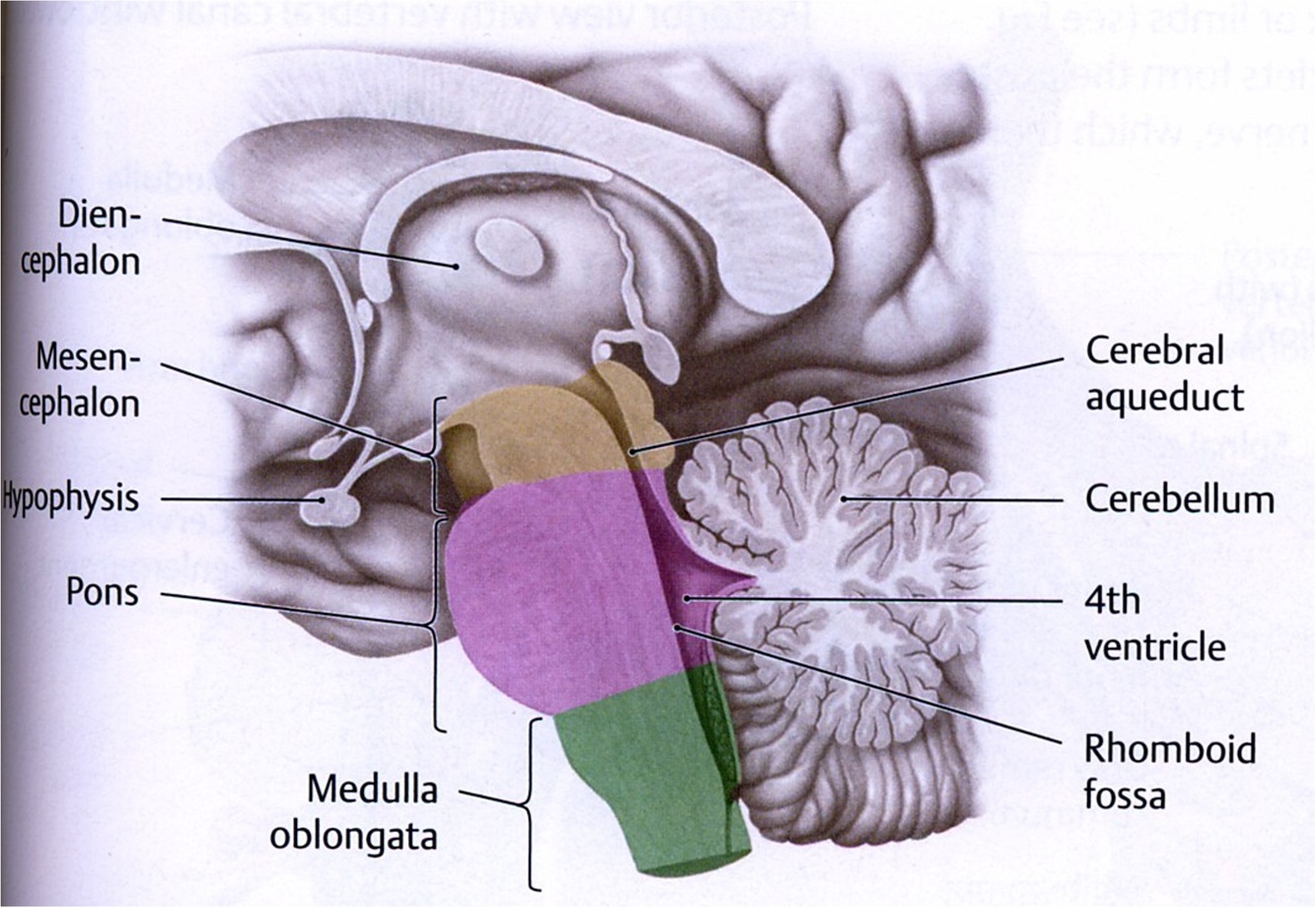 brainstem, medulla, pons, MB also responsible for