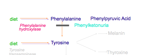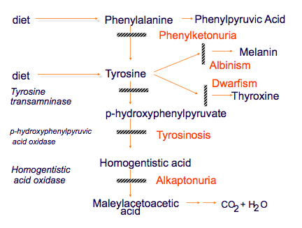 connected to PKU, albinism, dwarfism, tyrosinosis, alkaptonuria.