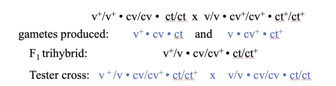 F1 trihybrid: v+/v * cv/cv+ * ct/ct+