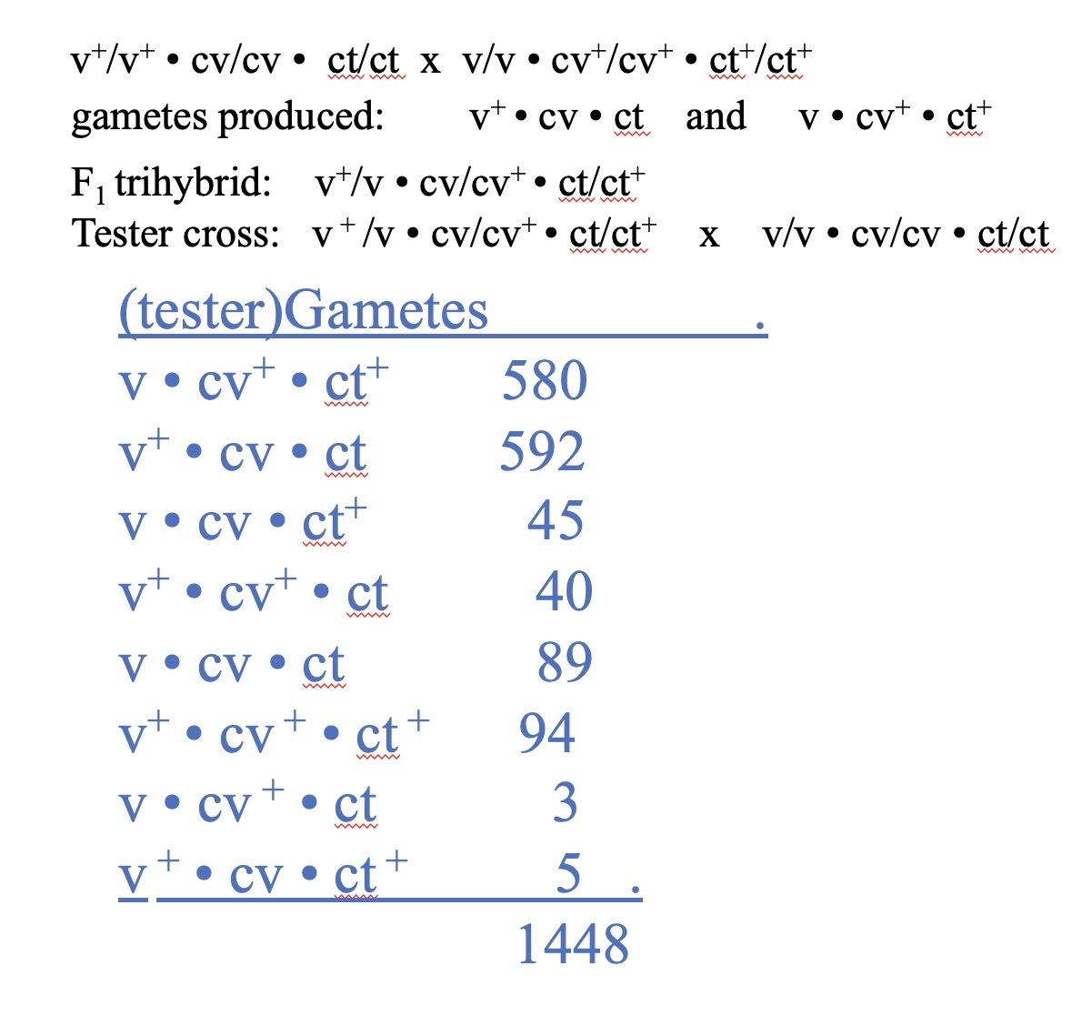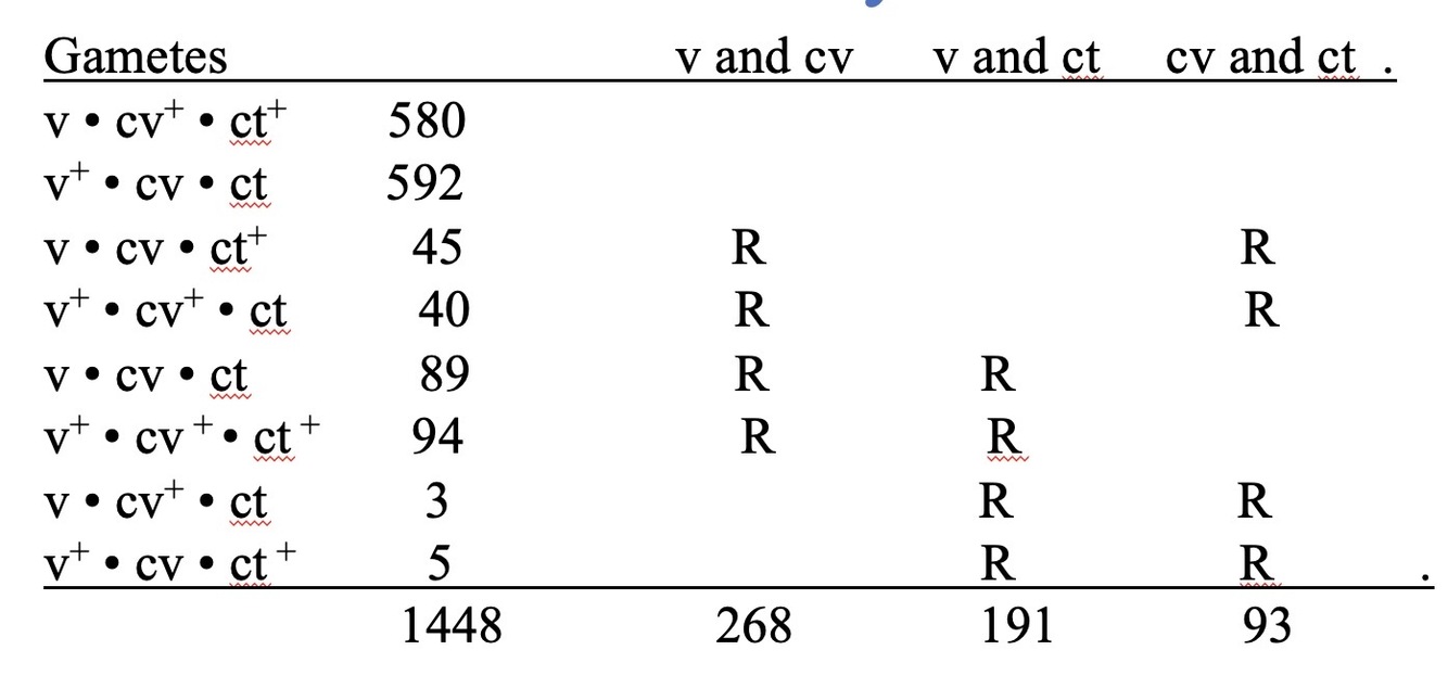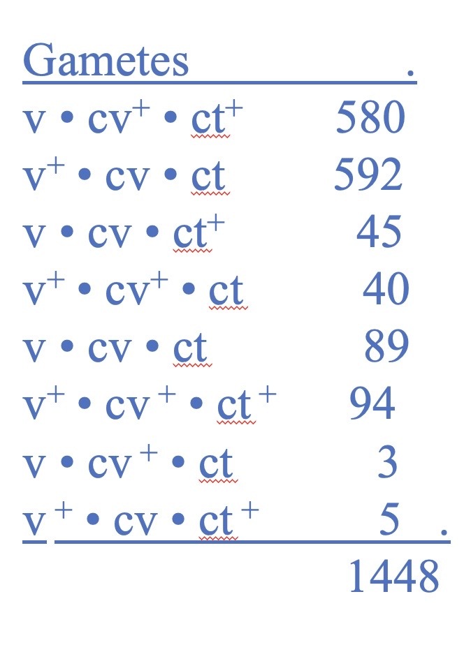 gametes produced: v+ * cv * ct and v * cv+ * ct+