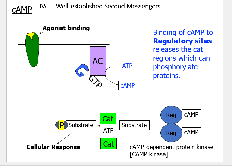 cAMP is 2nd messenger - released into cytoplasm due to 1st messenger (hormone) binding; a number of others in eukaryotic cells