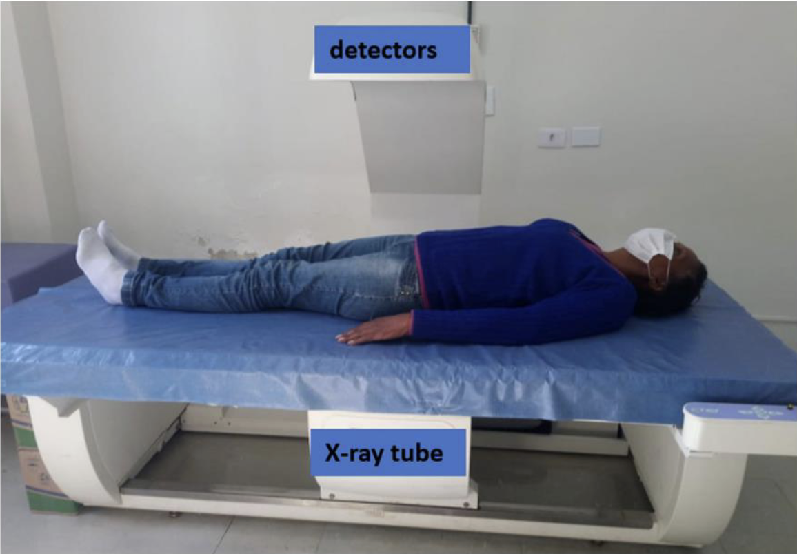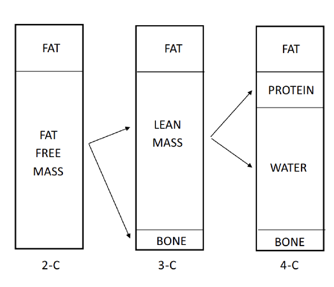 high and low energy x ray beams thru bodies and looks at fat mass, lean mass, and bone content.