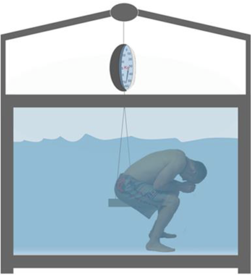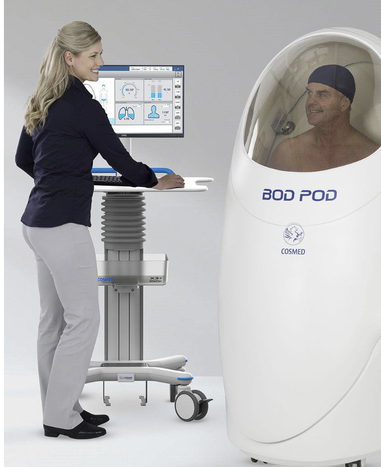 measures the pressure of the pod with and without the patient to find the volume and therefore DENSITY