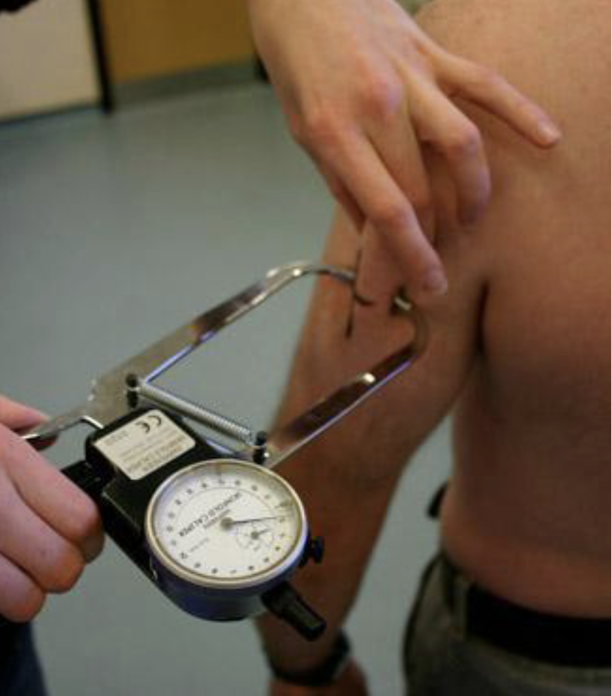 measure thickness of skinfold at various sites around the body, find the sum and put into an equation