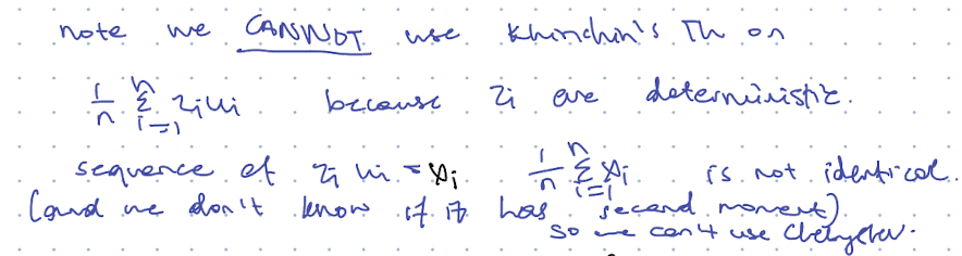 Describe why we cannot use Khinchin’s Theorem in multiple regression with deterministic z_i.