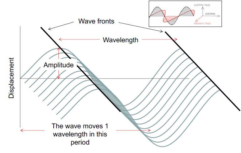 Light was described as a rapid variation in the electromagnetic field surrounding a charged particle, the variations in the field being generated by the oscillation of the particle. Visible light is between 0.4 to 0.7 um.