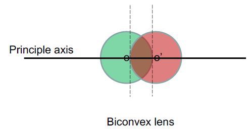 There is a small tangent region on the curved surfaces on the biconves lens that can act as parallel glass plate. A line that passes through the centres of the two radii is unrefracted which is called principle axis of the lens