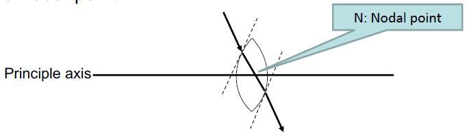 Away from the principle axis, at some point of the lens surfaces, the tangents of the points act as the parallel glass plate. The direction of propagation of the incident ray remained almost unchanged as they emerged. The point where the ray intercept the principle axis is called a nodal point.
