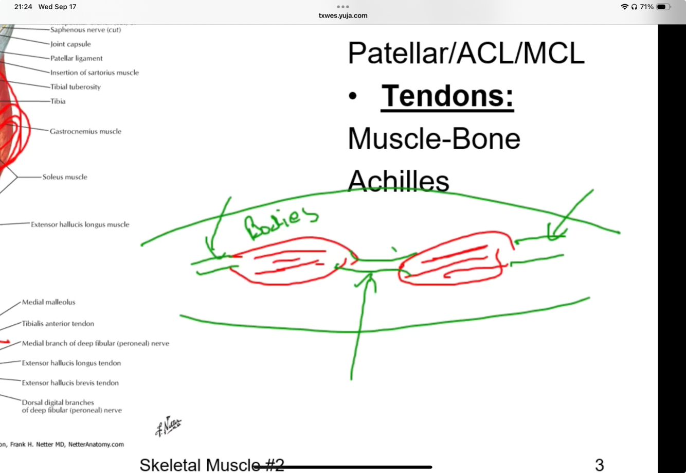 Normal tendon in healthy muscle- when in normal position; fastened appropriately placement of tendon takes entire skeletal muscle and stretches out to an optimal length