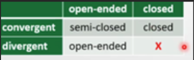 Also, eine “Closed” Frage ist immer “konvergent”, weil die möglichen und die richtigen Antworten im Voraus bekannt sind. Eine “open” Frage kann aber “divergent” sein, weil die richtigen Antworten nicht im Voraus festgelegt sind und von den gegebenen Antworten abhängen.