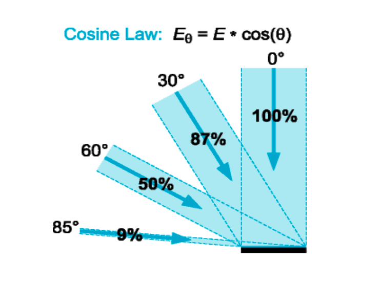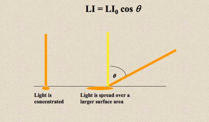 Light intensity (LI) at the ground is influenced by its angle of incidence, which depends on the relative height of the sun above the horizon