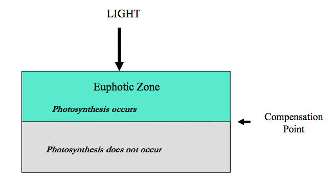 Water depth where light intensity is above the compensation point (high enough to support photosynthetic organisms).
