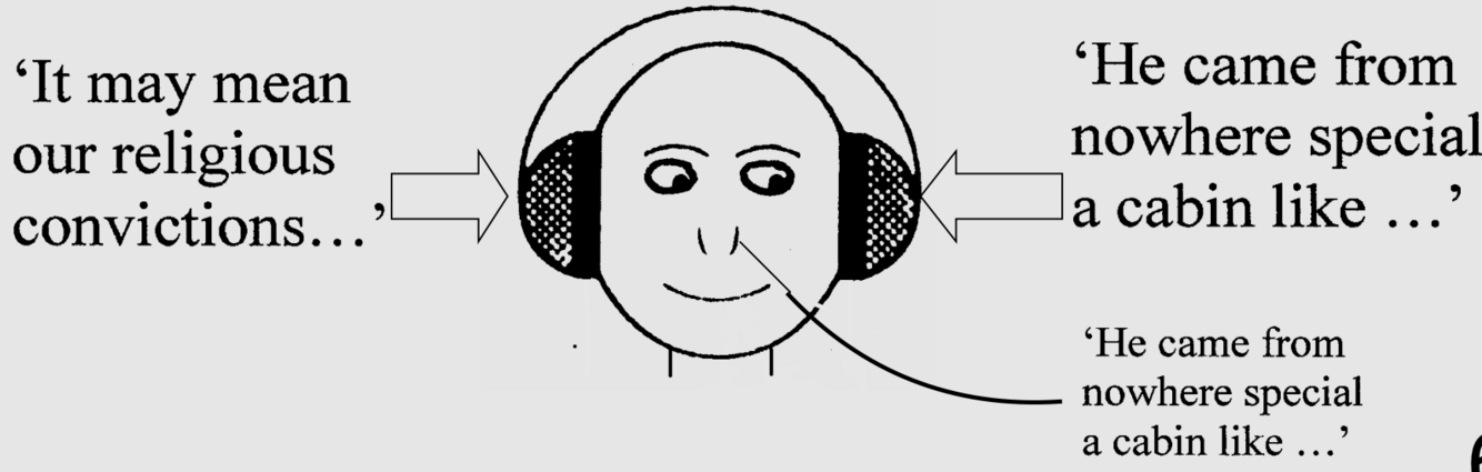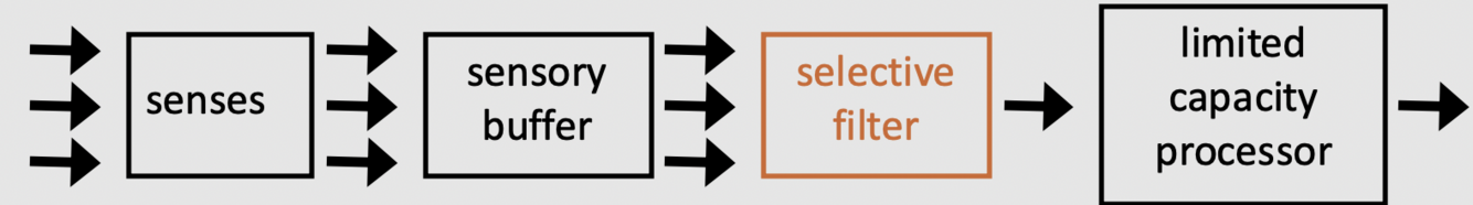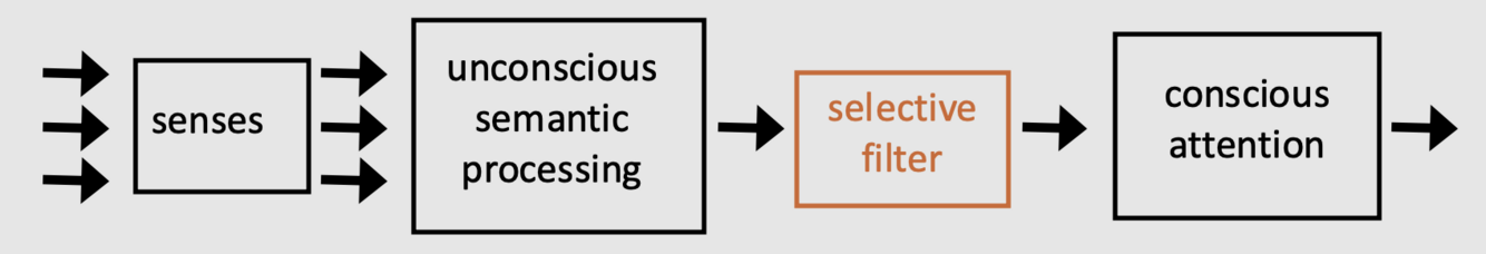 70% of ppl fail to notice the auditory gorilla man “I’m a gorilla” repeated for 19s when attending to the women’s conversation