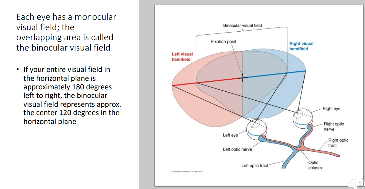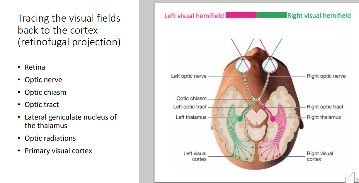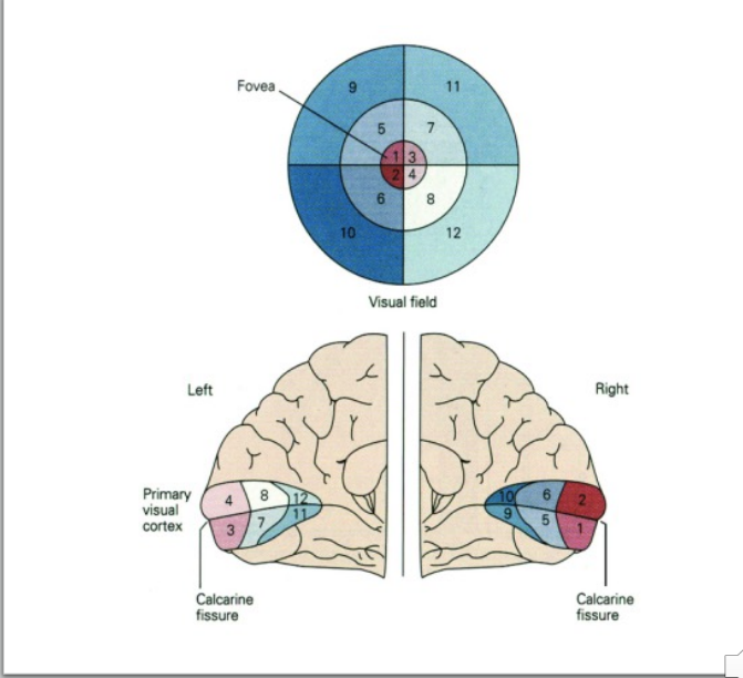 Areas of left and right visual field are represented in specific areas on the retina which align with the somatotopy of the visual cortex